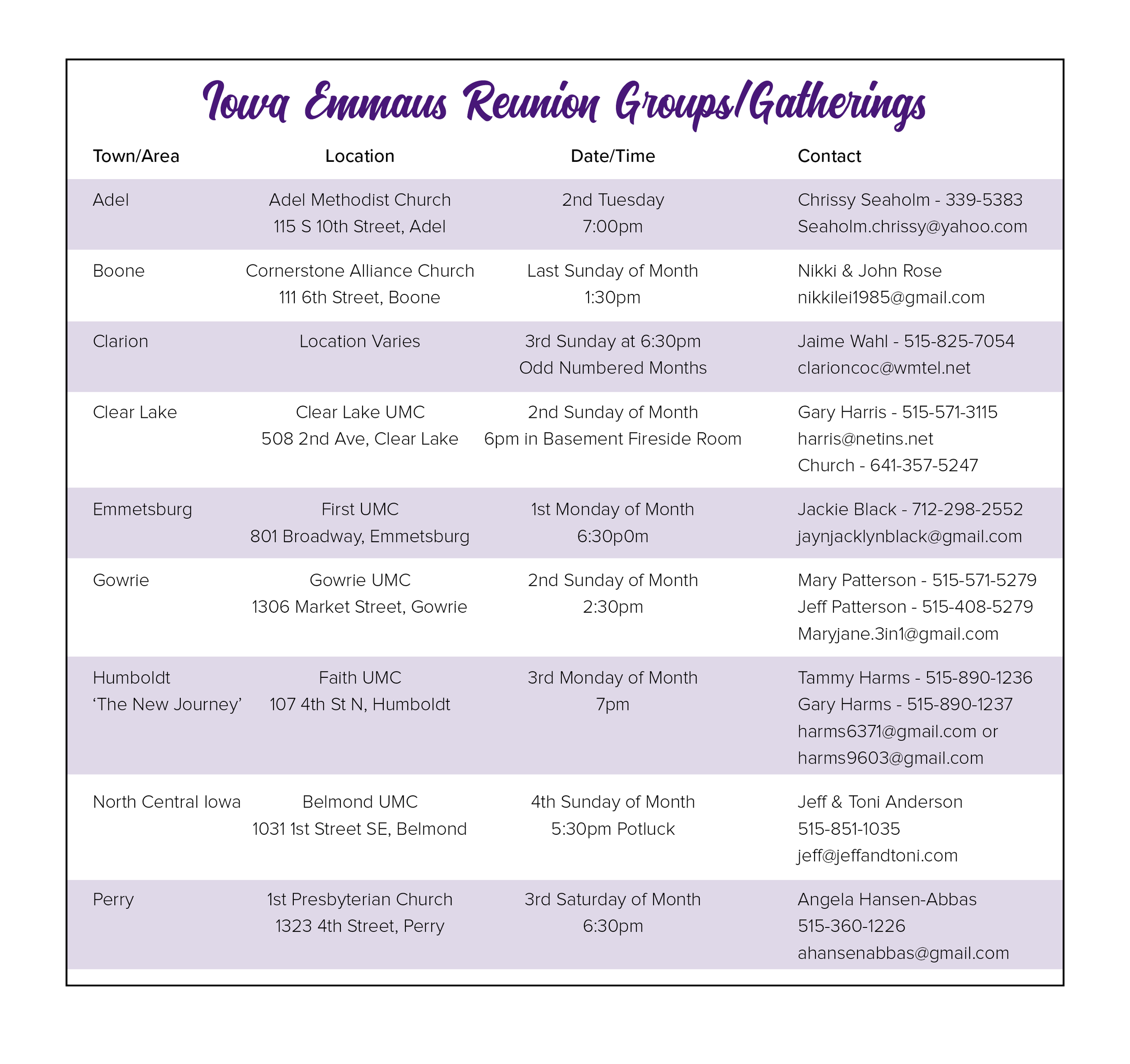 Community Gatherings are a way to stay connected to the Emmaus community. Reunion groups can be a formal or informal affair - with 2 or 200 people. If you don’t see a group close to you - gather some Emmaus friends and get one going. Let us know your meeting time, location and contact person. We’ll add your group to the list! If you have questions, don’t hesitate to contact us.