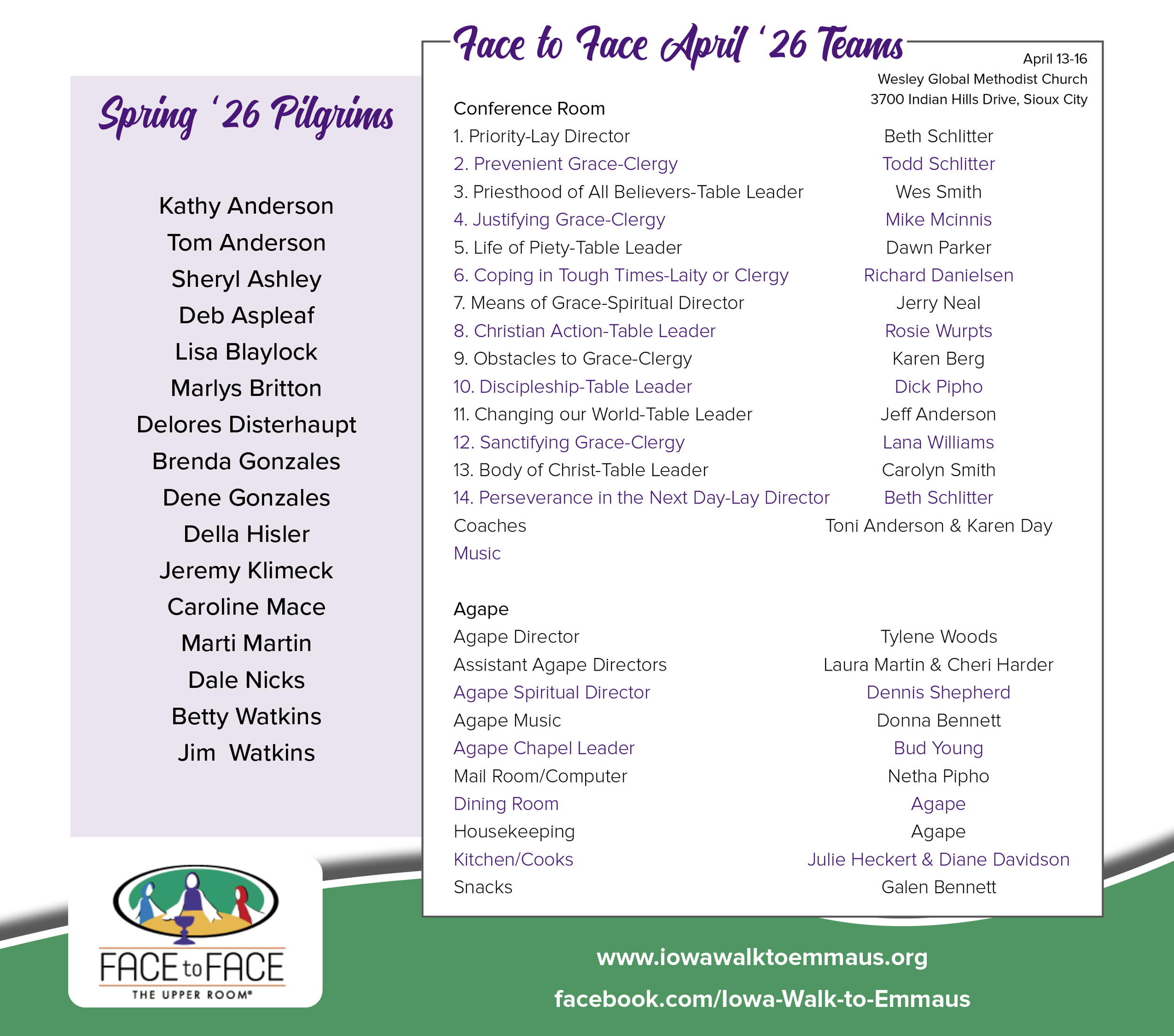 Face to Face Encounter - April 13-16Wesley Global Methodist Church3700 Indian Hills Drive, Sioux City, IowaBeth Schlitter is the Lay Director Contact her at 712-899-4629 or bethschlitter@gmail.comCheck Back Soon - God is Working on the Details! Learn More about Face to Face Team Cannon