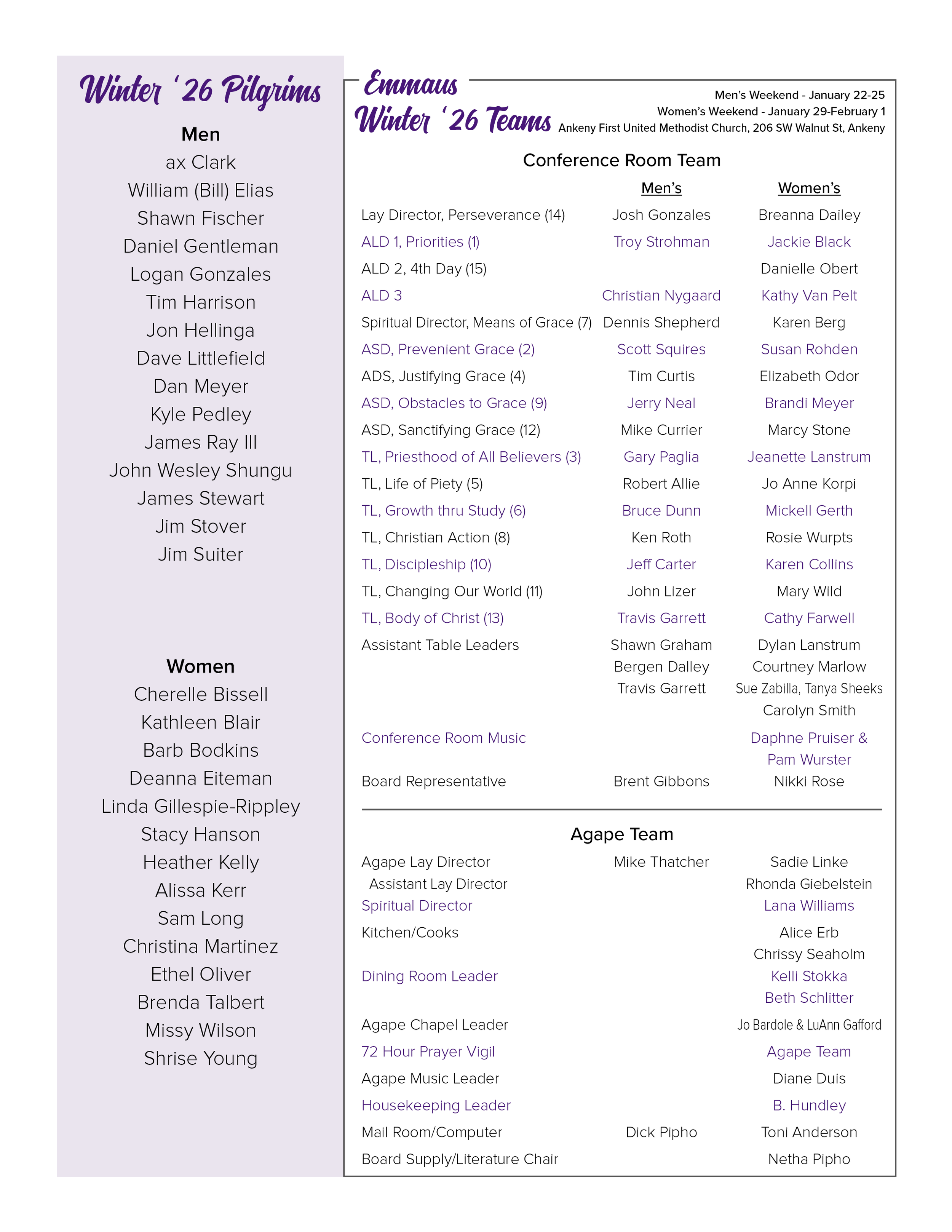 Winter Emmaus 2026Men: January 22-25 Women: January 29-February 1Ankeny First United Methodist Church, 206 SW Walnut Street, Ankeny, Iowa
